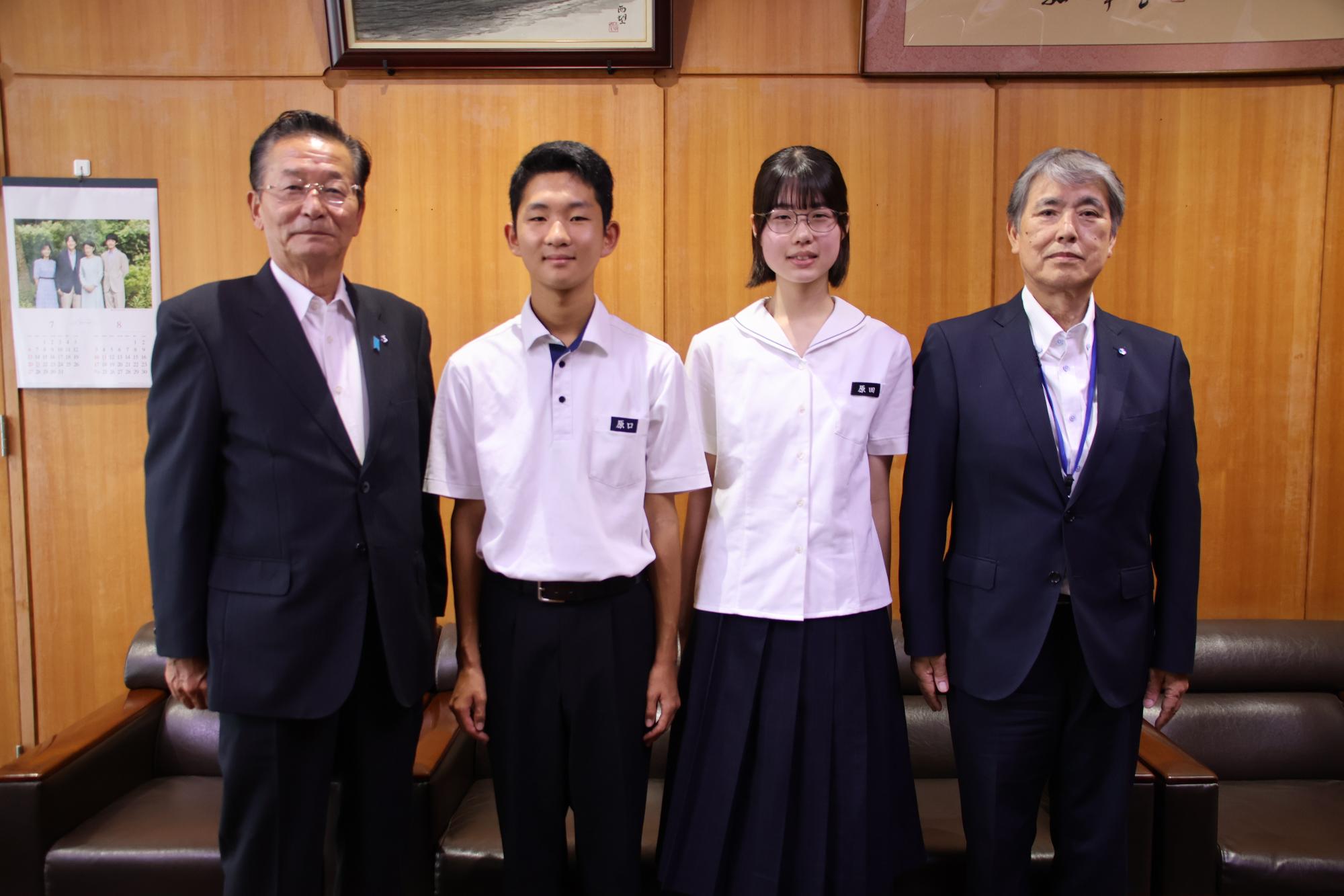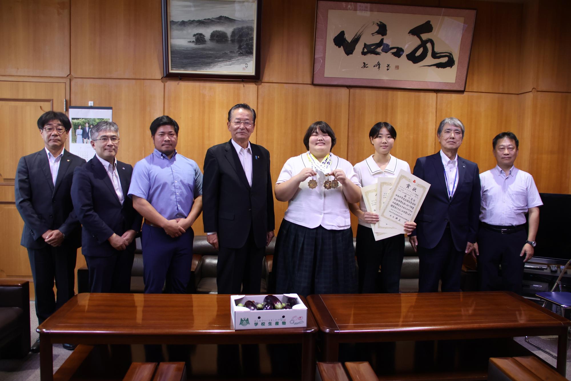 全国高校総合体育大会(中国総体)重量挙げ女子76キロ超級で優勝した西彼農業高等学校の森 七菜実さんが市役所を訪れ、優勝報告を受けました。