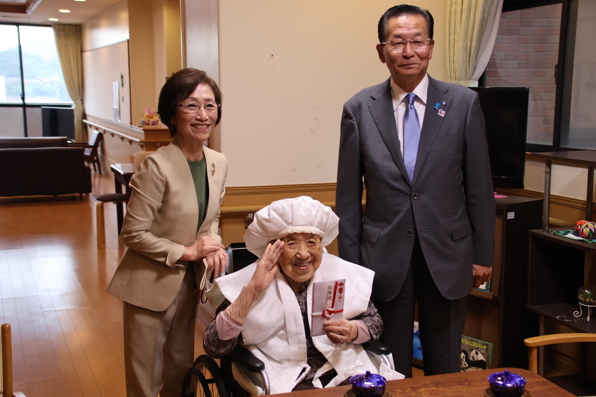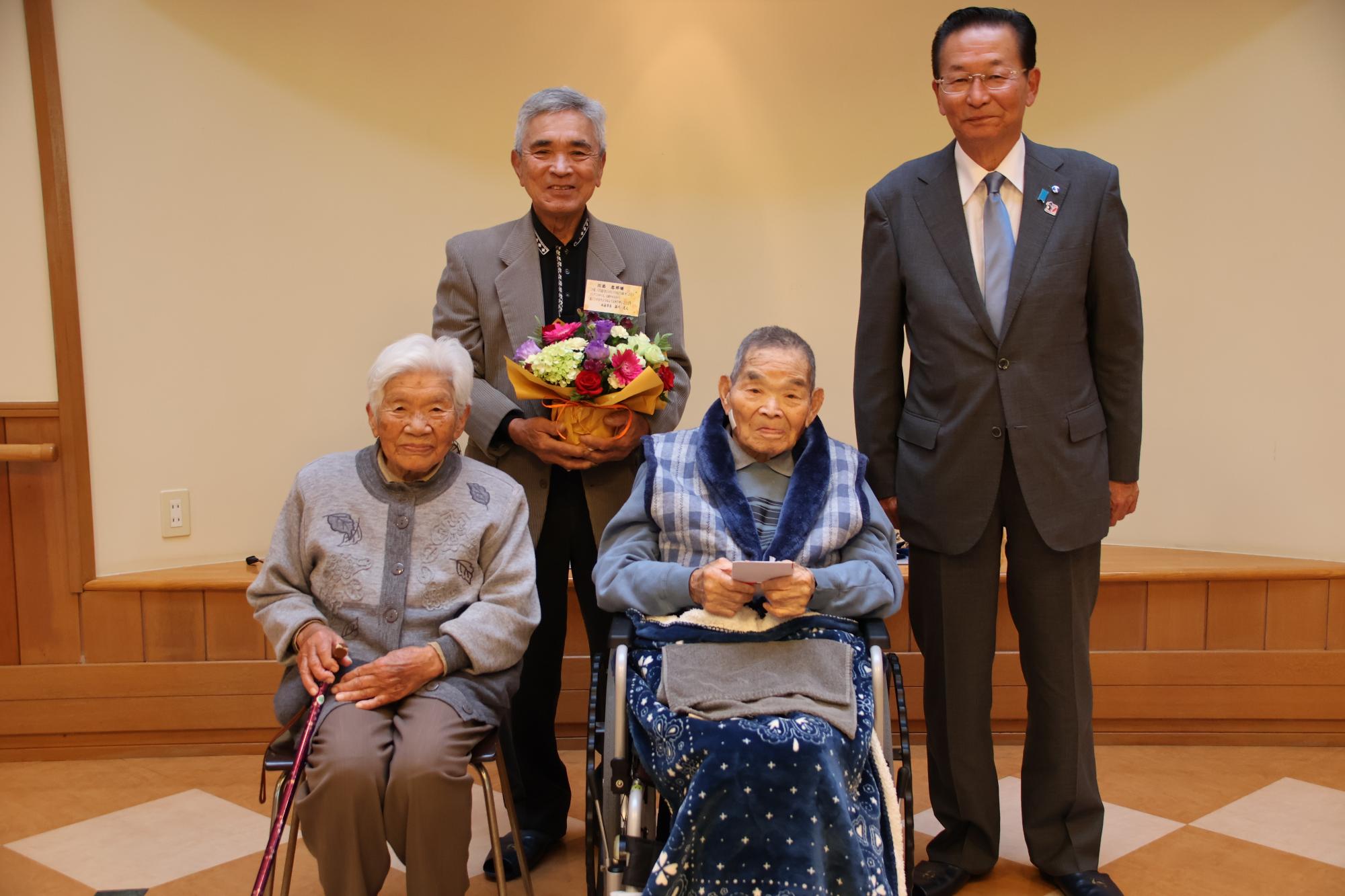 お二人の百歳を迎えられた方のお祝いに伺いました。